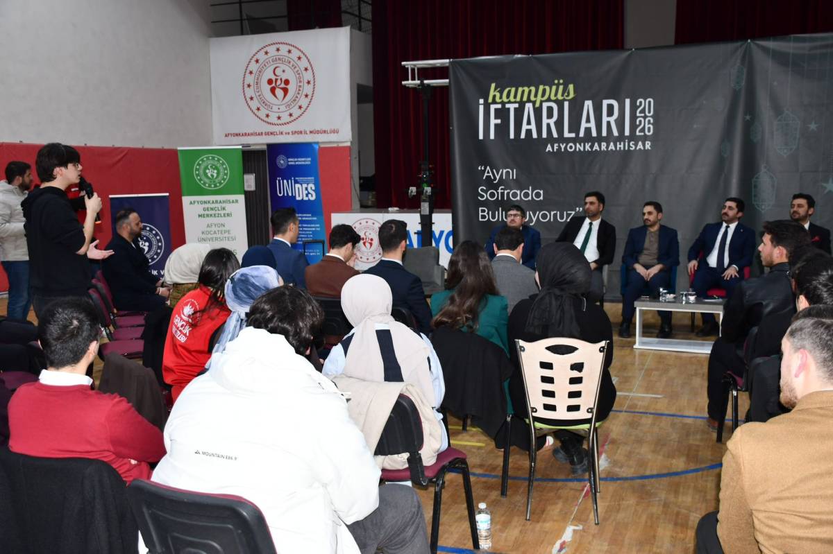 Afyonkarahisar Prof. Dr. Veysel Eroğlu Spor Salonu’nda gerçekleştirilen “Kampüs İftarları 2026 Programı”, üniversite öğrencileri başta olmak üzere 1300’ü aşkın gencin katılımıyla gerçekleşti. Programa Afyonkarahisar Valisi Dr. Naci Aktaş, AKÜ Rektörü Prof. Dr. Mehmet Karakaş, AFSÜ Rektör Yardımcısı Prof. Dr. Ahmet Ali Tuncer, Uluslararası Gençlik Programları Daire Başkanı Feyyaz Soydoğan, Gençlik Merkezleri Daire Başkanı Yahya Kılıç, kurum müdürleri ve çok sayıda öğrenci katıldı.