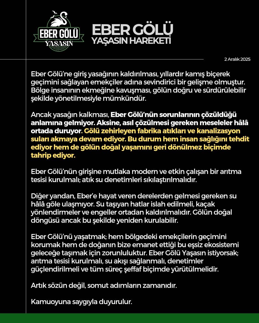 Eber Gölü Yaşasın Hareketi, göle giriş yasağının kaldırılmasının sorunları çözmediğini belirterek yetkililere acil çağrıda bulundu. Açıklamada, göle fabrika atıkları ve kanalizasyon sularının akmaya devam ettiği vurgulanarak, “Eber Gölü’nün girişine mutlaka modern ve etkin çalışan bir arıtma tesisi kurulmalı” ifadelerine yer verildi.