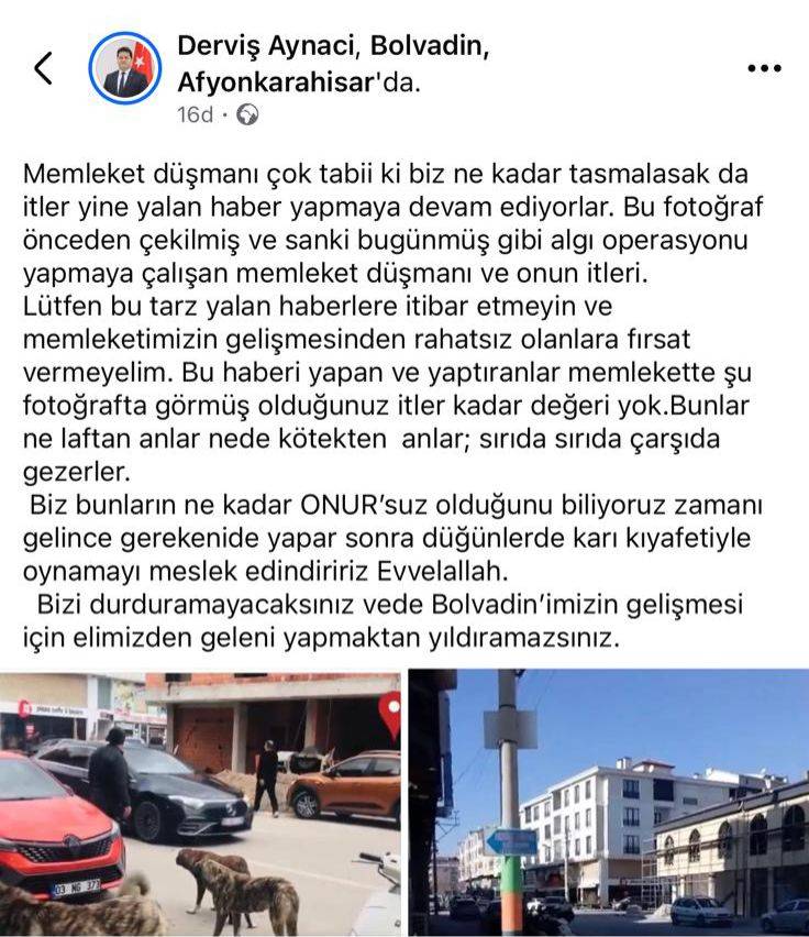 Afyonkarahisar’ın Bolvadin ilçesinde yaşanan olay kamuoyunda geniş yankı uyandırdı. Bolvadin Belediye Başkanı Derviş Aynacı’nın, belediyeyi eleştiren gazetecilere yönelik sosyal medya paylaşımında kullandığı ifadeler tepki çekti.