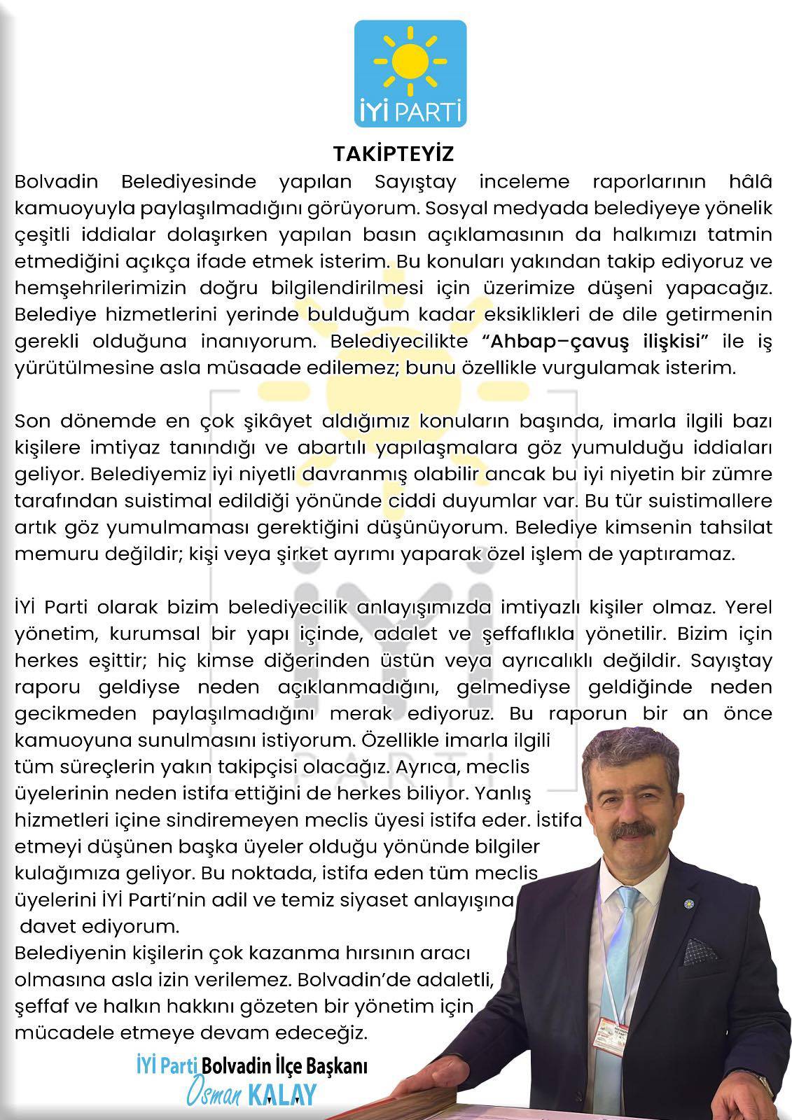 İYİ Parti Bolvadin İlçe Başkanı Osman Kalay, Bolvadin Belediyesi ile ilgili değerlendirmelerde bulunarak Sayıştay inceleme raporlarının hâlâ kamuoyuyla paylaşılmadığını belirtti. Kalay, sosyal medyada belediyeye yönelik çeşitli iddiaların dolaştığını, yapılan basın açıklamasının ise halkı tatmin etmediğini ifade etti.