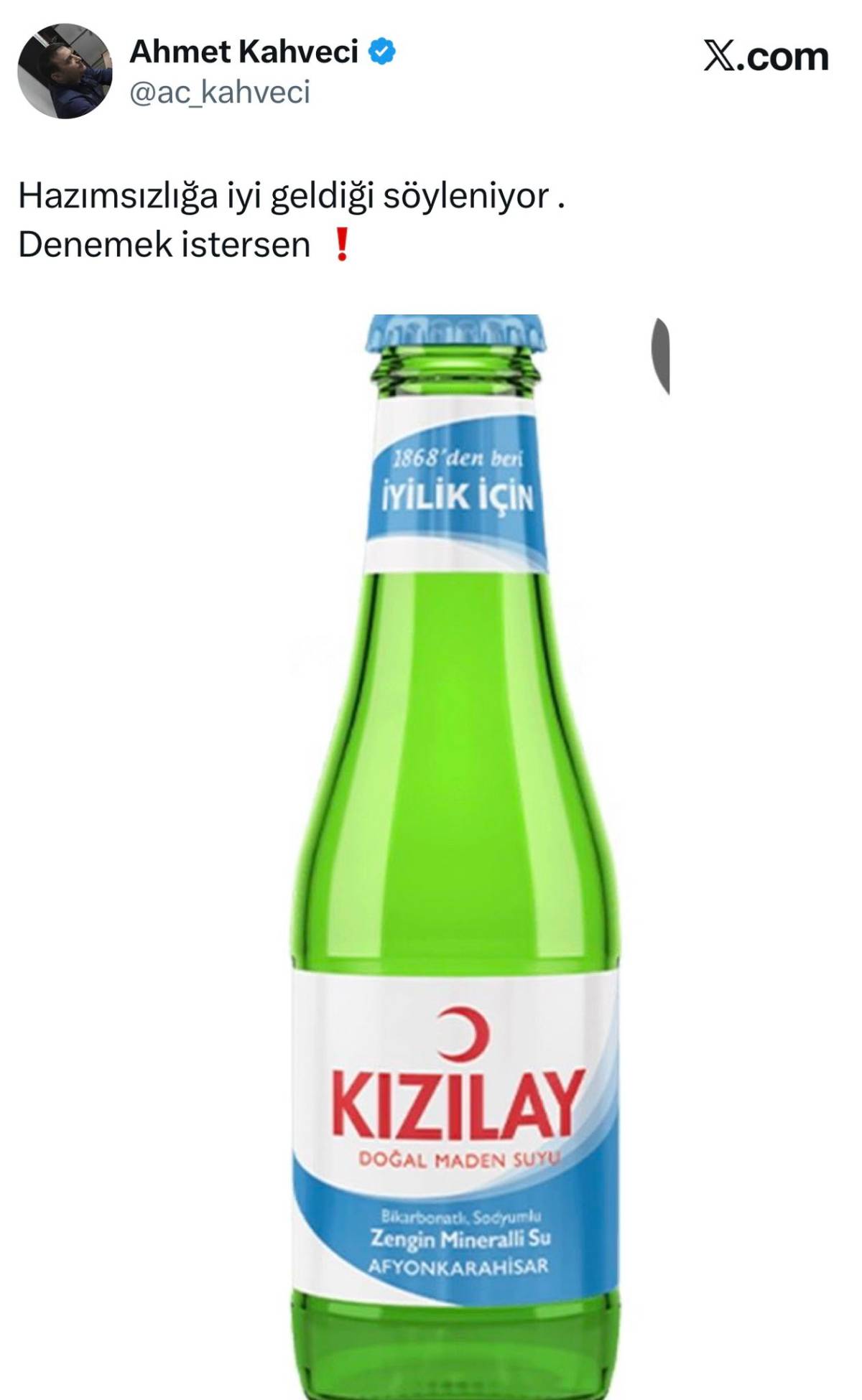 Milliyetçi Hareket Partisi (MHP) Afyonkarahisar İl Başkanı Ahmet Kahveci paylaşımında, “Hazımsızlığa iyi geldiği söyleniyor. Denemek isterseniz…” ifadelerini kullanarak dikkat çekti.