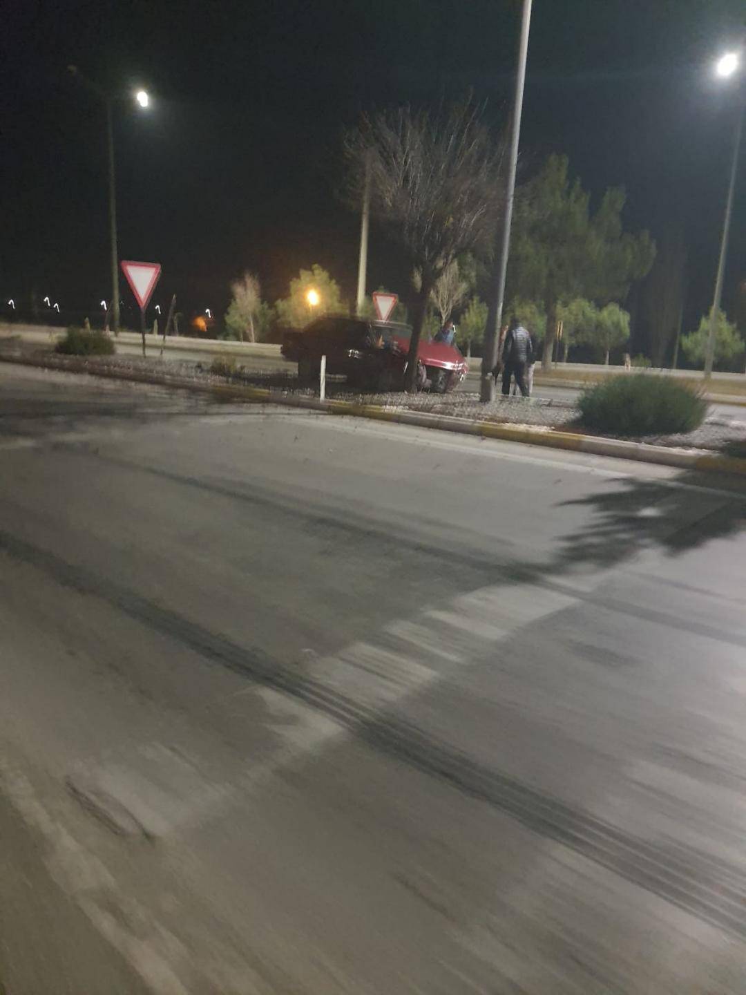 Peş peşe yaşanan kazalar nedeniyle orta refüjde bulunan trafik levhaları ve ağaçlar devrildi.