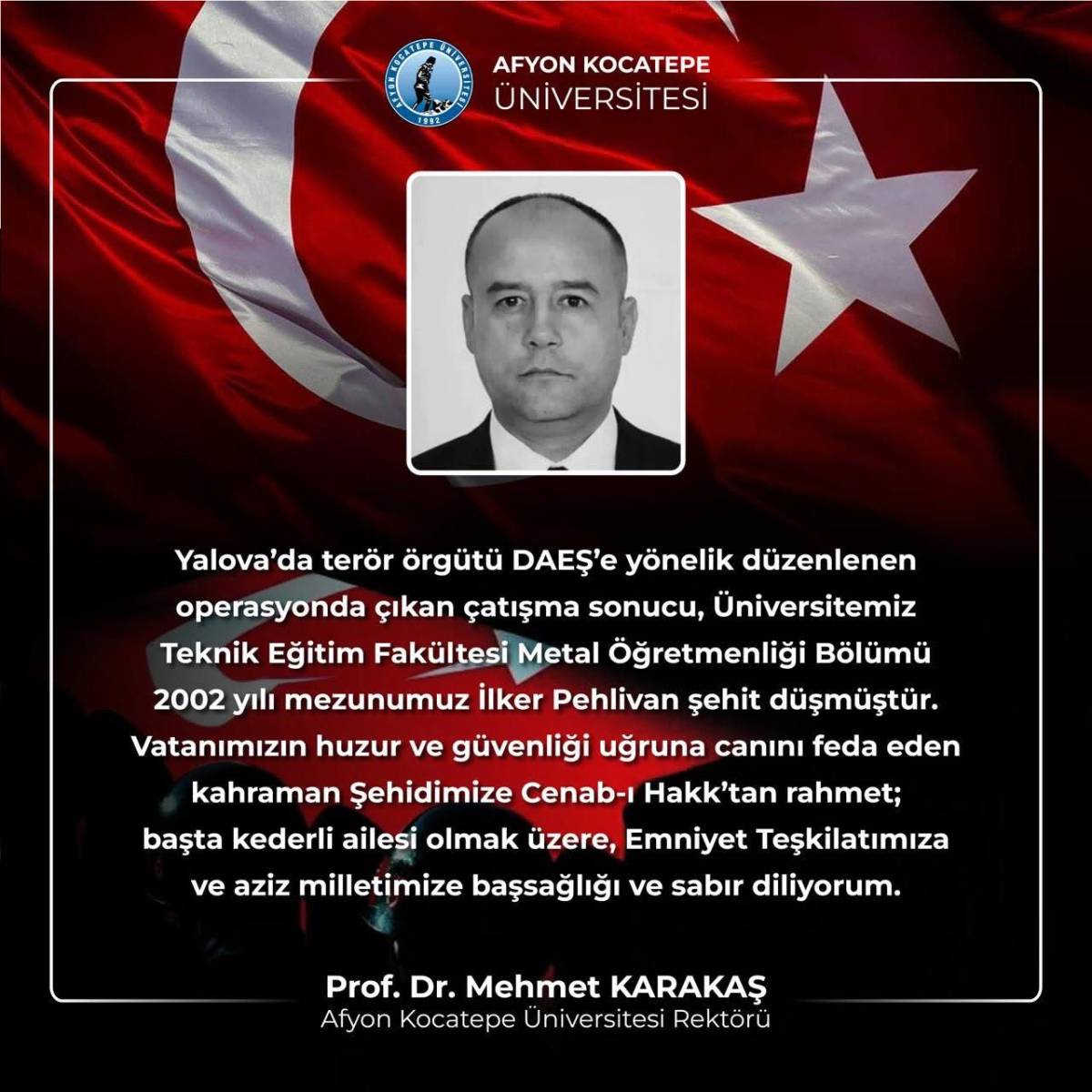 Afyon Kocatepe Üniversitesi Rektörü Prof. Dr. Mehmet Karakaş, şehit polis memuru İlker Pehlivan için taziye mesajı yayımladı. Karakaş mesajında şu ifadelere yer verdi: